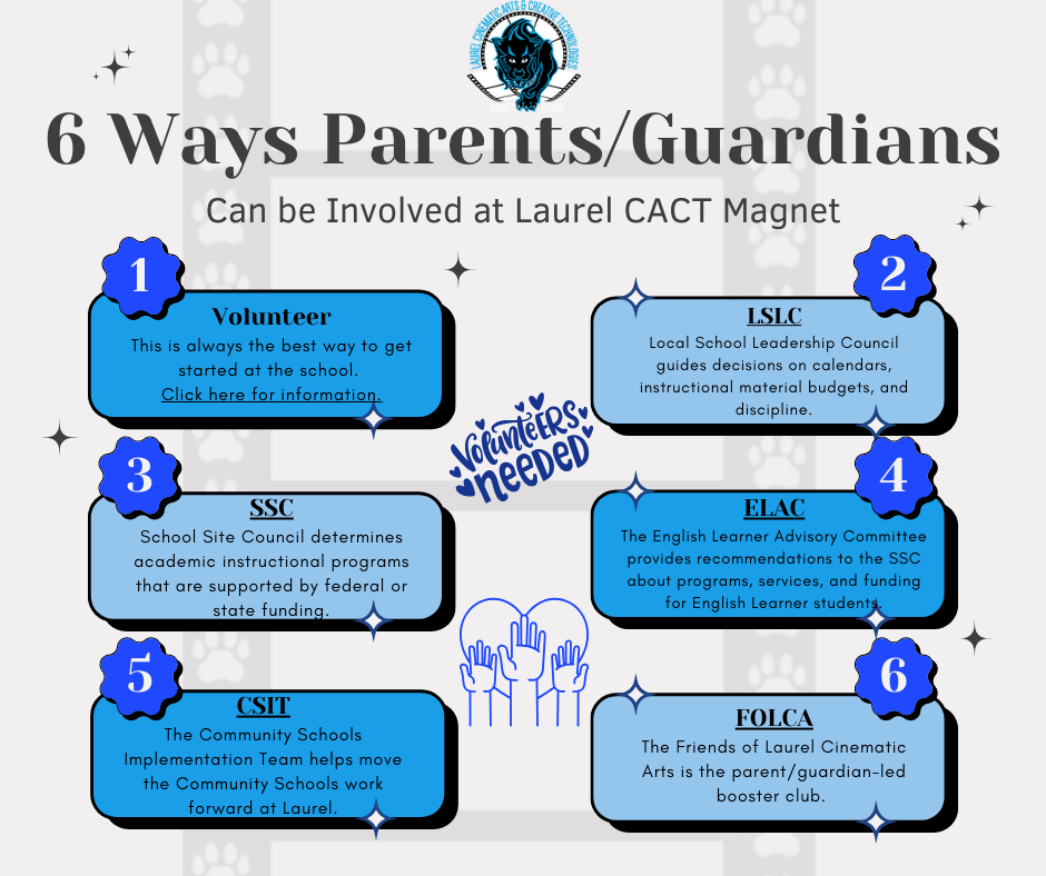 Parents and guardians must access the online application through the district’s School Volunteer Management System. This system can be accessed by going to the LA Unified Volunteer Application here. You will need to log in using your Parent Portal Account Information. Once the application is complete, please register with our school for a project that you would like to volunteer with using the Laurel CACT Volunteer Interest Form. View LAUSD's Quick Guide here for an overview of expectations.